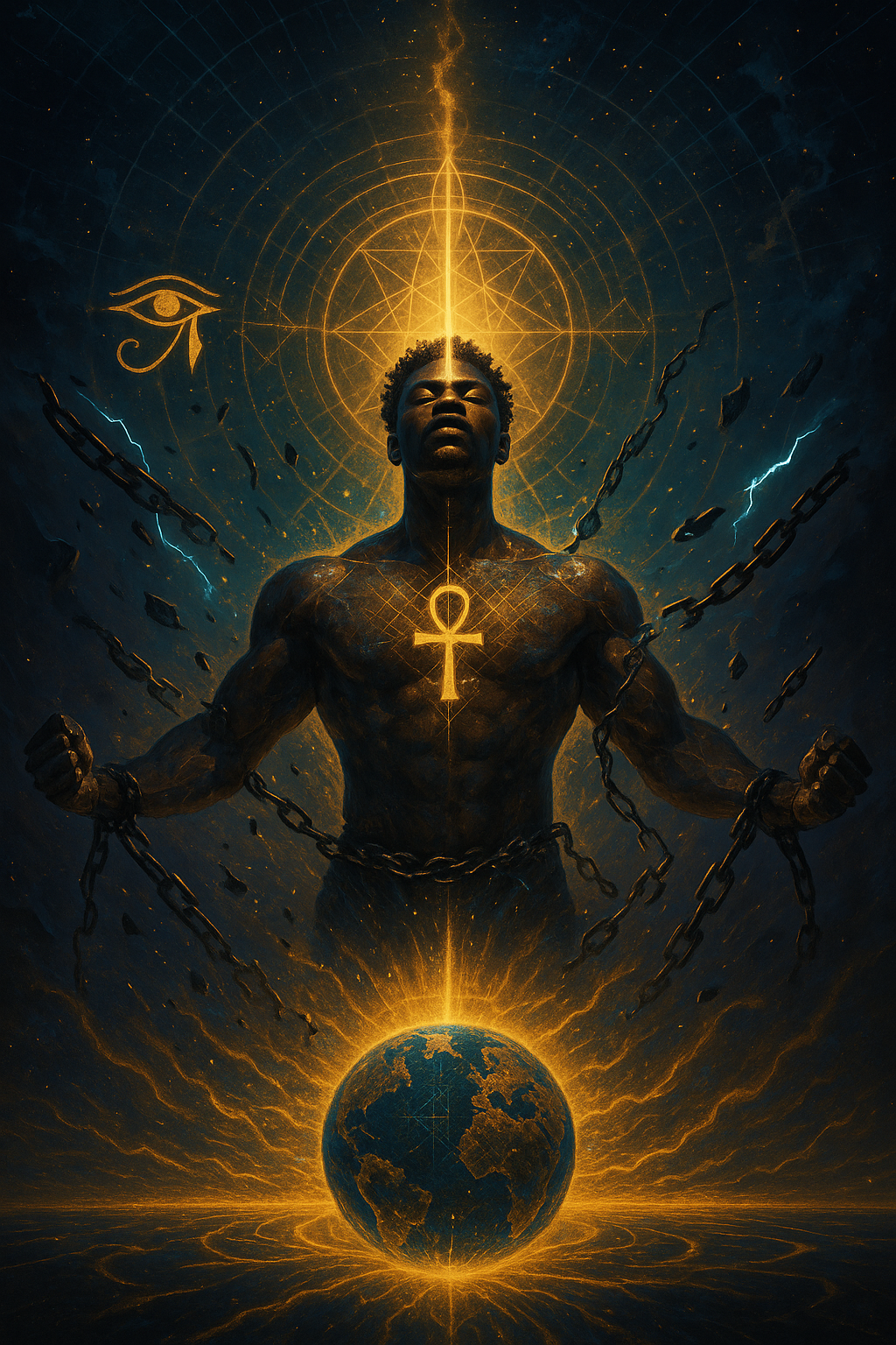 This artwork is a living embodiment of liberation, divine power, and cosmic remembrance. Emerging from chains that shatter into pieces, the God figure rises in strength, illuminated by the golden radiance of ancient knowledge and spiritual awakening. The Ankh at his chest glows as the eternal key of life, while a brilliant stream of light flows from his crown into the cosmos, connecting him to the eternal source of creation.At his feet, the Earth radiates with golden energy, symbolizing the restoration of balance and the awakening of humanity through divine masculine power. The Eye of Horus looks on, guarding the sacred truth of inner vision and eternal remembrance.“Return of the God” represents the breaking of generational chains, the rise of true kingship, and the reclamation of divine authority. It is a piece of empowerment, sovereignty, and remembrance of the sacred role of man as a protector, creator, and bearer of light.Perfect for those walking the path of ascension and inner power, this piece is more than art it is an initiation, an activation, and a call to rise.